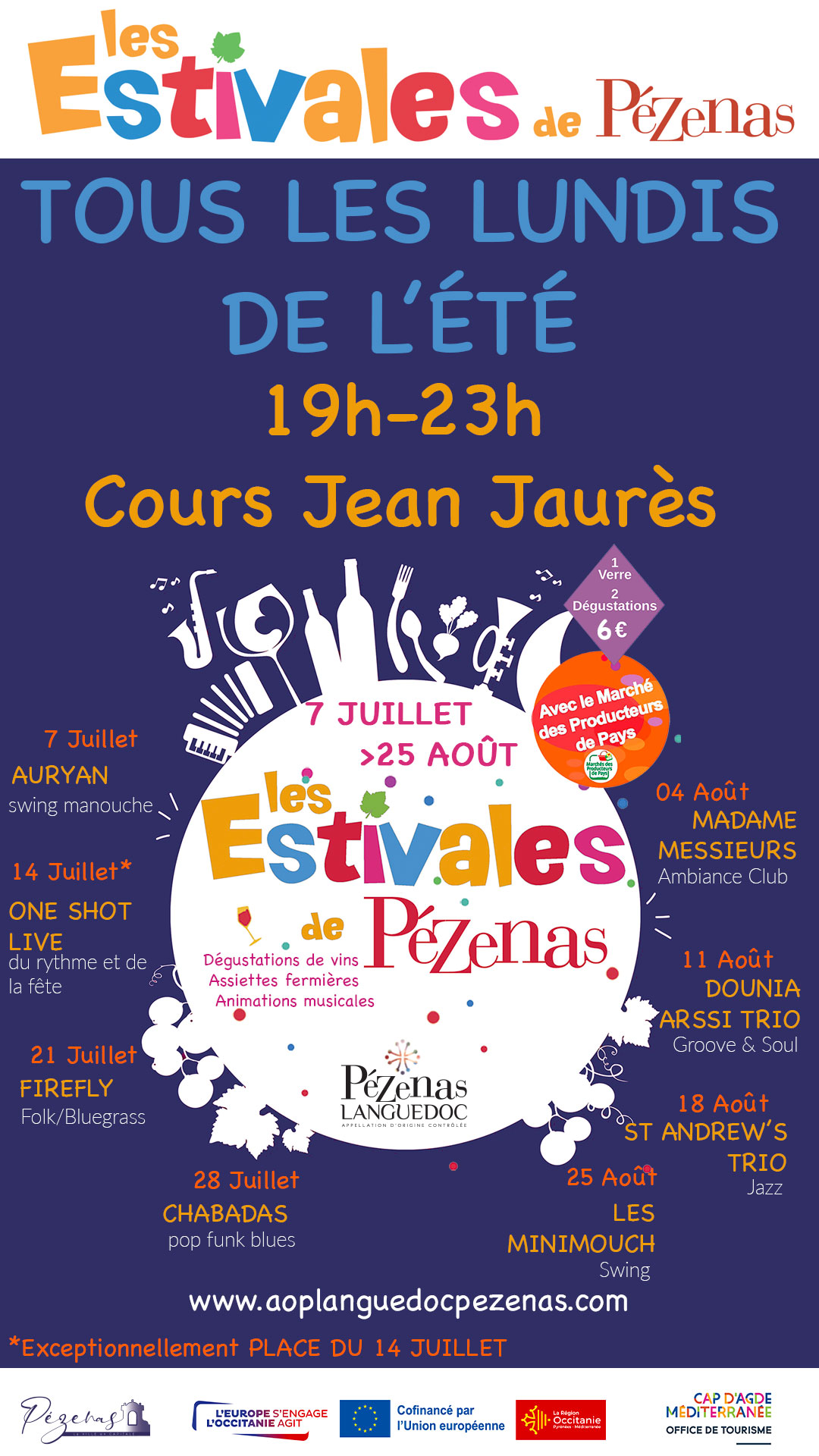 Du 7 Juillet au 25 Août 2024, chaque lundi soir de 19h à 23h, rejoignez-nous sur le Cours Jean Jaurès à Pézenas pour une ambiance festive et conviviale.